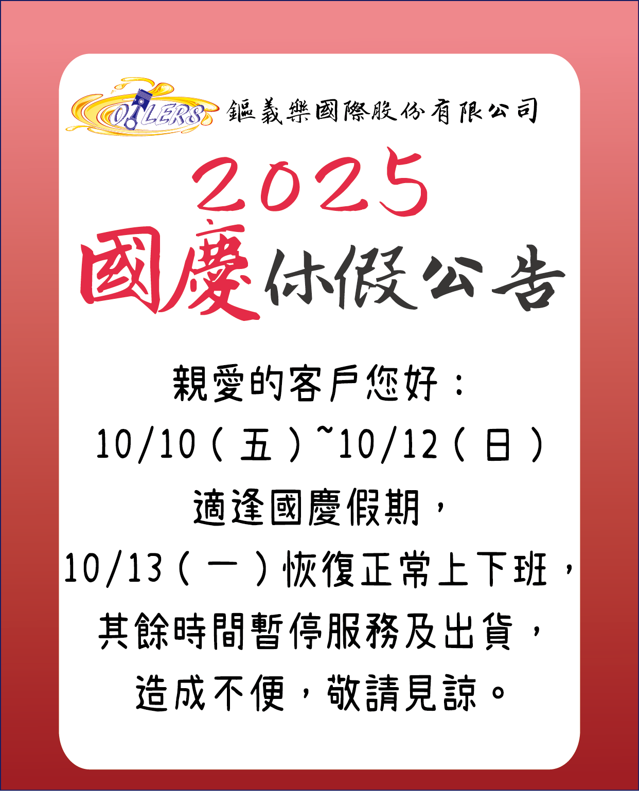 【公告】114/10/10~114/10/12為國慶連續假期,鏂義樂於114/10/13繼續為您服務,造成不便,請見諒。