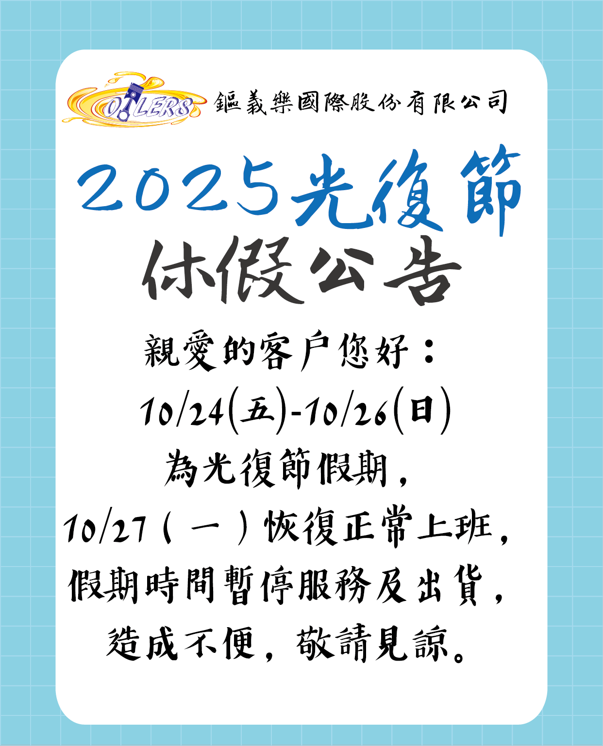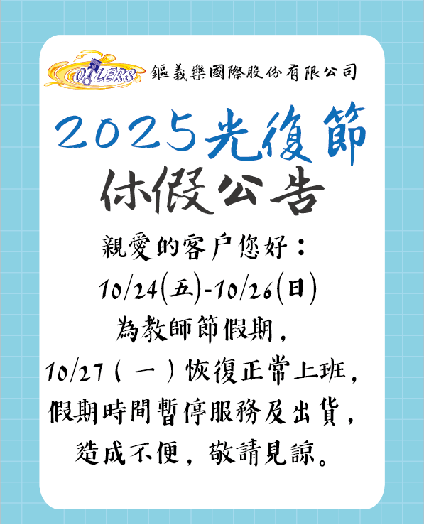 【公告】114/10/24~114/10/26為光復節連續假期,鏂義樂於114/10/27繼續為您服務,造成不便,請見諒。