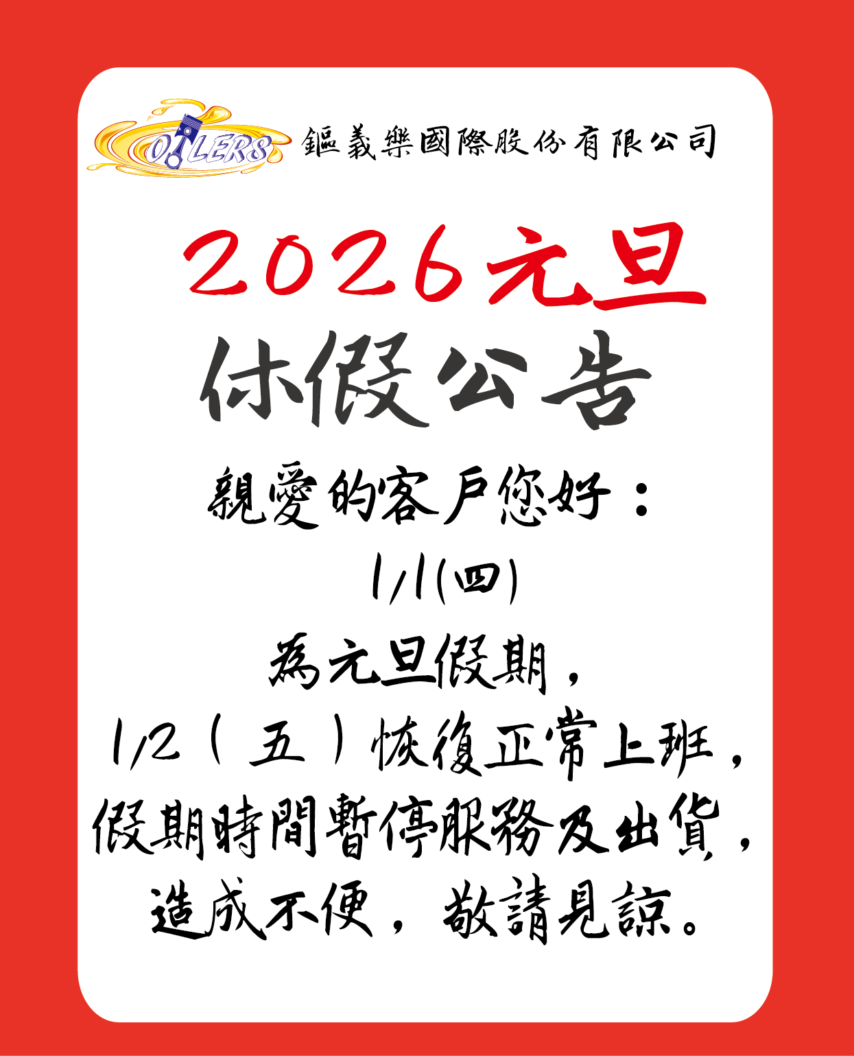 【公告】115/1/1為元旦假期,鏂義樂於115/1/2繼續為您服務,造成不便,請見諒。