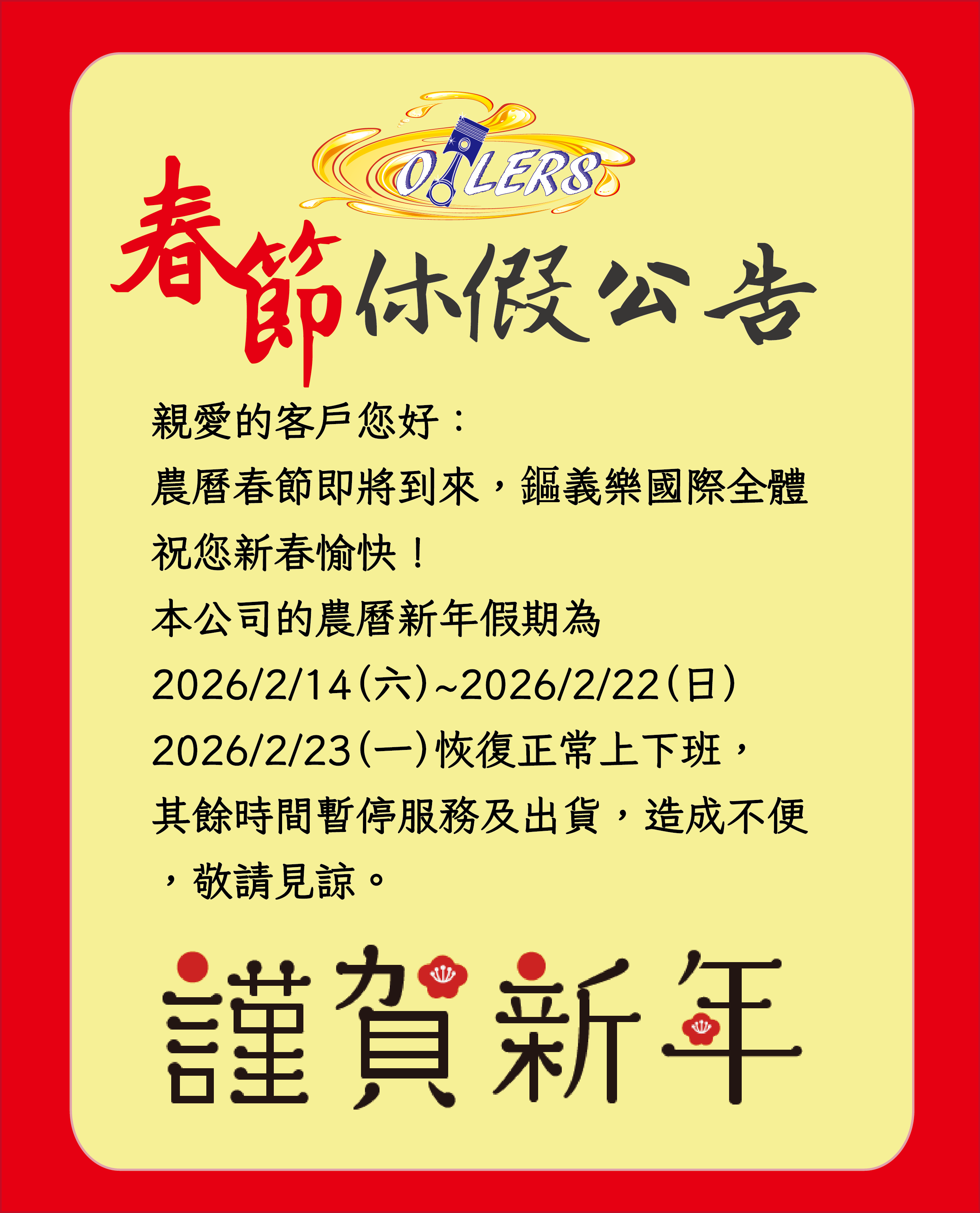 【公告】貨運年前收貨至2/11,送貨至2/13,鏂義樂春節假期為2/14~2/22,2/23正式開工